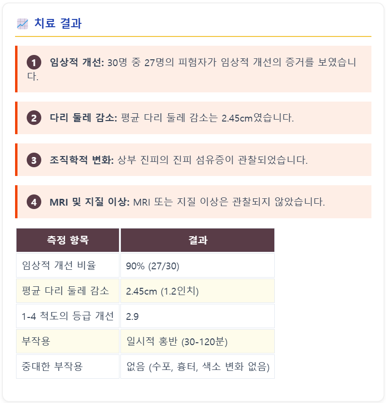 중요한 점은 RF와 HIFES 강도를 환자의 피드백과 내약성에 따라 0%에서 100% 범위에서 개별적으로 조절했다는 것입니다. HIFES는 35%~75% 강도로, RF는 대부분 100% 강도로 적용되었으며(한 명의 환자는 RF 75%를 견딤), 이는 환자 맞춤형 치료의 가능성을 보여주는 대목입니다.2